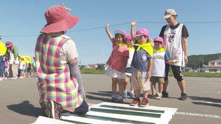 子どもたちは実際の道路を横断し交通ルールについて学びました。